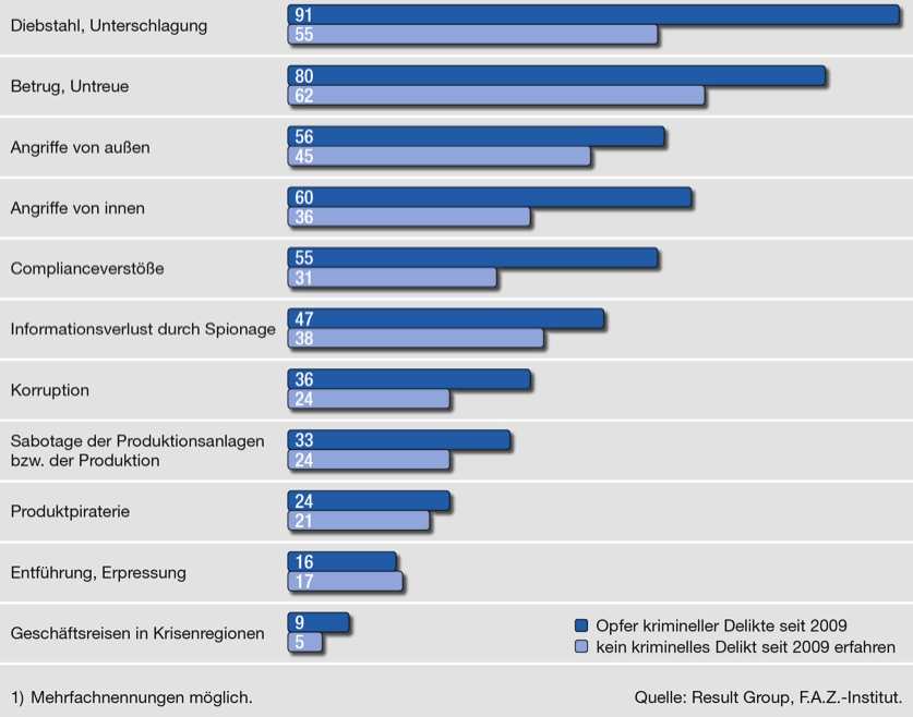 Die Studie „Kriminelle Risiken im Mittelstand – Gefahren, Schäden und Prävention“ wurde im Januar 2014 im Auftrag der Result Group durchgeführt. Forsa und das F.A.Z.-Institut befragten 100 Entscheider aus deutschen Unternehmen mit 50 bis 500 Mitarbeitern nach ihren Erfahrungen mit Wirtschaftskriminalität, ihrer Einschätzung der gegenwärtig und zukünftig besonders gefährdeten Unternehmensbereichen und ihren Präventionsmaßnahmen für die Bereiche Risikomanagement, Compliance und Informationsschutz.