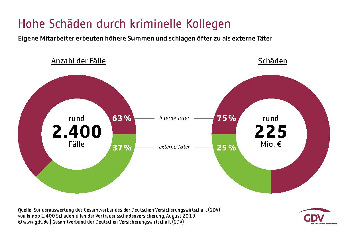 Das geht aus Zahlen des Gesamtverbandes der Deutschen Versicherungswirtschaft (GDV) hervor, der rund 2.400 Schadenfälle aus der Vertrauensschadenversicherung ausgewertet hat. Die Vertrauensschadenversicherung entschädigt Unternehmen, wenn interne oder externe Vertrauenspersonen Gelder veruntreuen oder das Unternehmen betrügen.