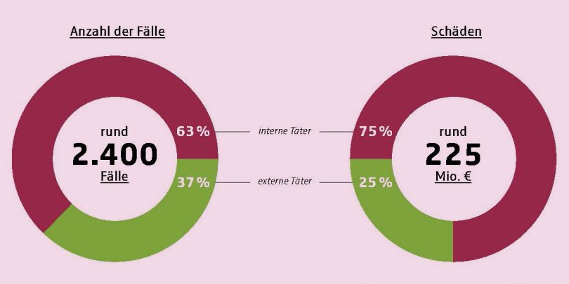 Weil die Belegschaft einen Vertrauensvorschuss genießt und die Sicherheitslücken im Unternehmen genau kennt, können die internen Täter in aller Regel hohe Summen erbeuten: Im Schnitt bringen kriminelle Mitarbeiter ihre Arbeitgeber um fast 115.000 Euro, bevor sie auffliegen. Externe Betrüger kommen im Schnitt gerade mal auf die Hälfte dieser Summe.