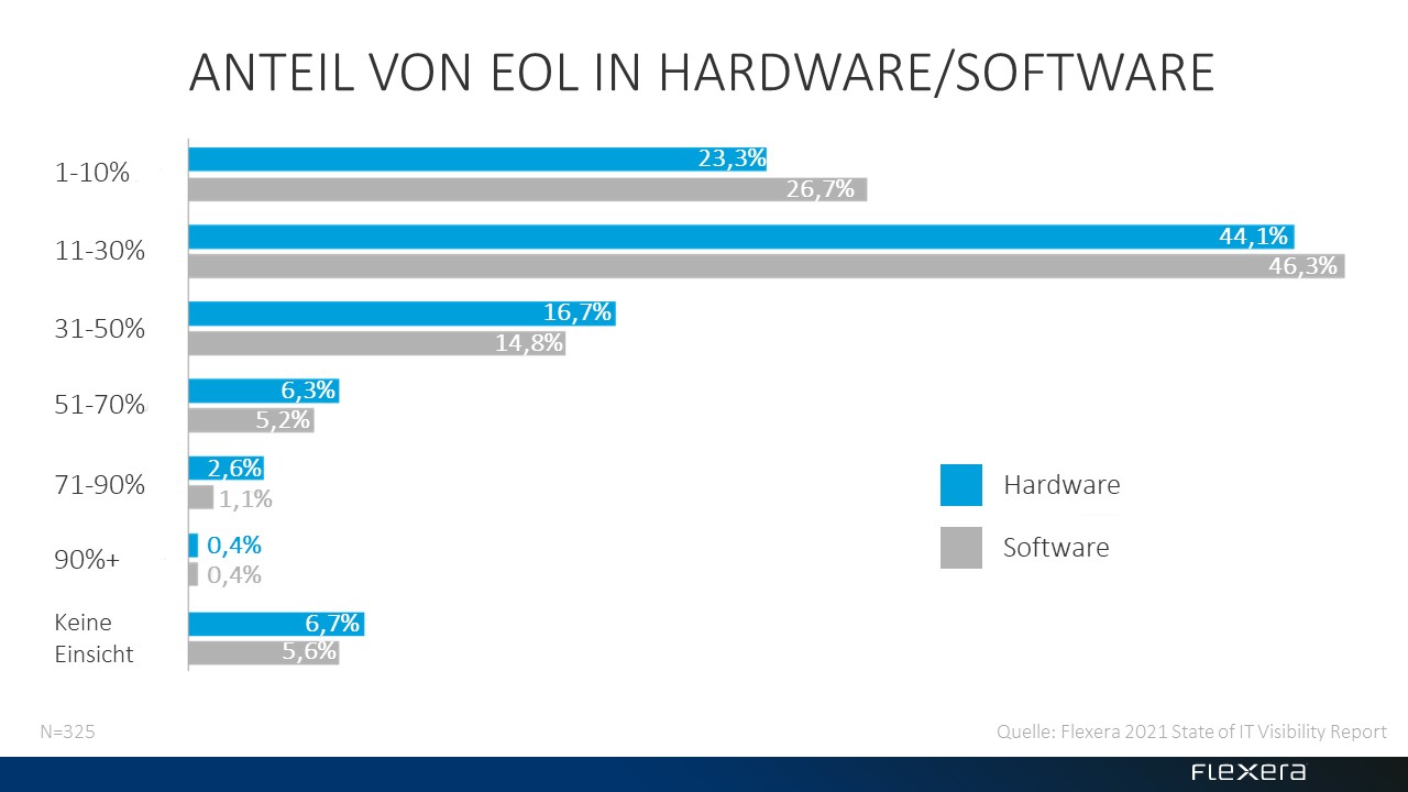 Dabei sind es keinesfalls nur unbedarfte Privatanwender. Auch in vielen Unternehmen und Organisationen sind veraltete Computer, Betriebssysteme und Anwendungen noch häufig im Einsatz. Nach einem Report von Flexera finden sich in zwei Dritteln (67%) der Unternehmen noch Hardware, die bereits ihr EOL/EOS erreicht hat. Auf Software-Seite sind in es sogar noch 73% der Unternehmen.